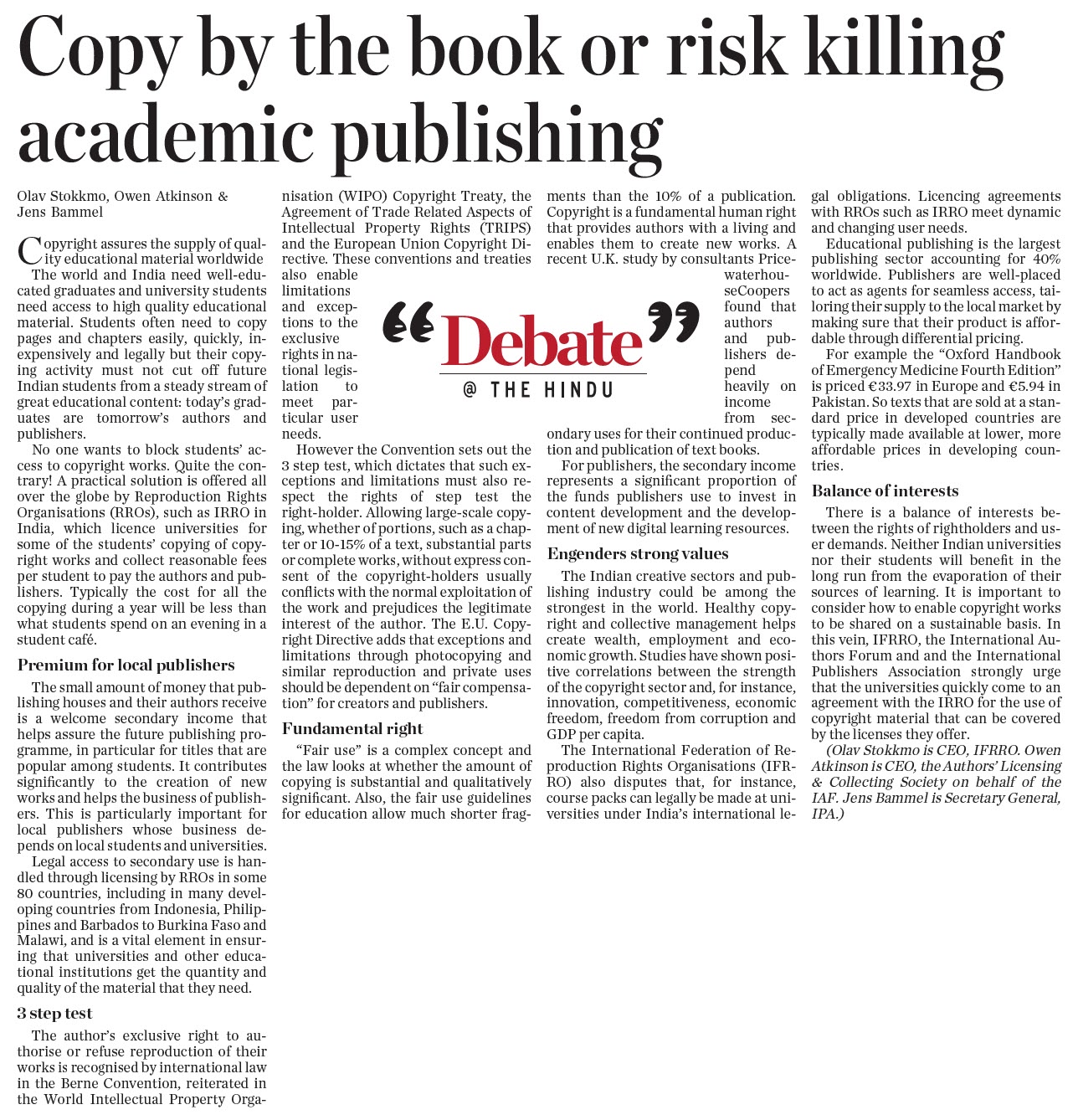 Copy by the book or risk killing academic publishing--Author: Olav Stokkmo, Owen Atkinson & Jens Bammel (Source-The Hindu, 18 May 2013)